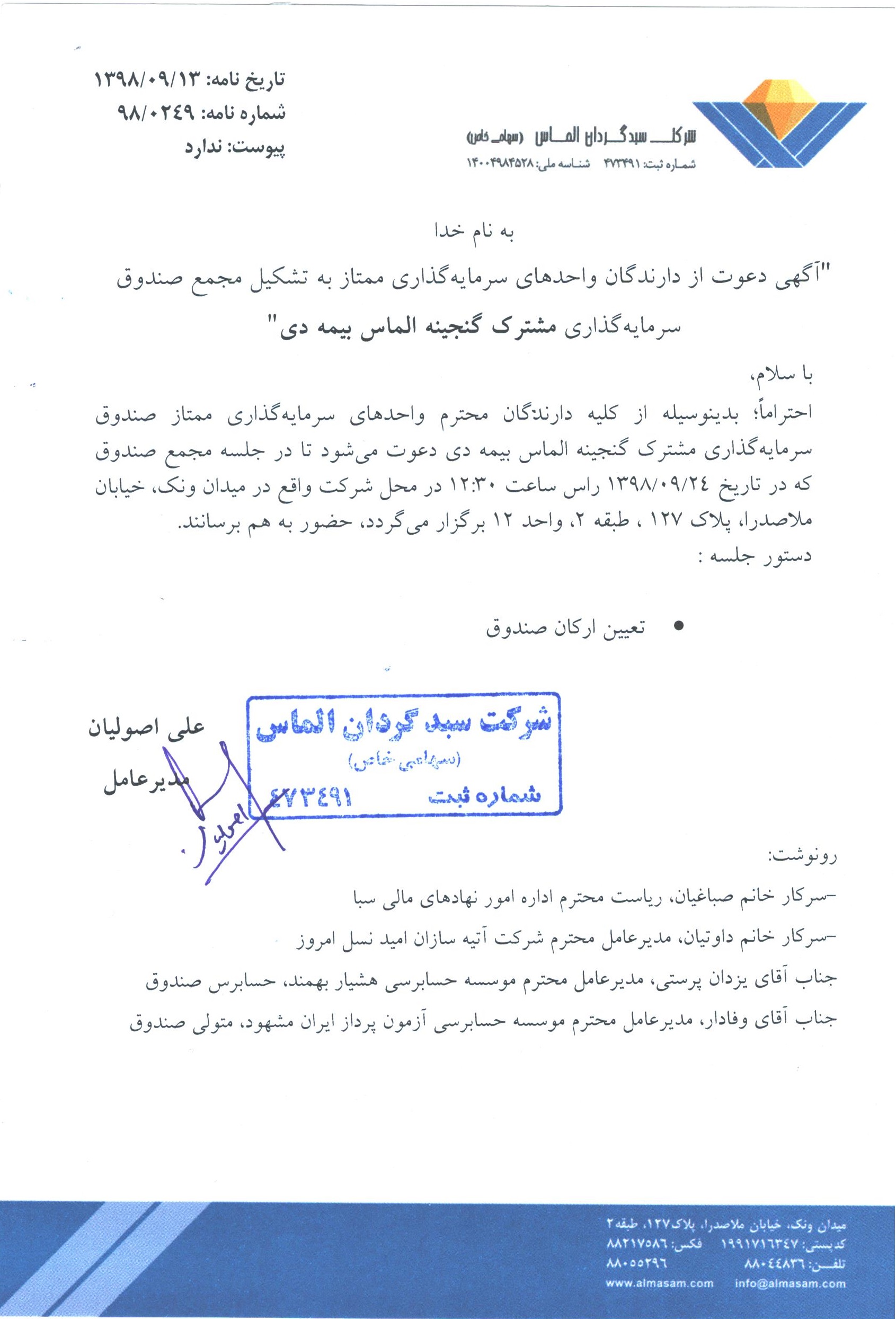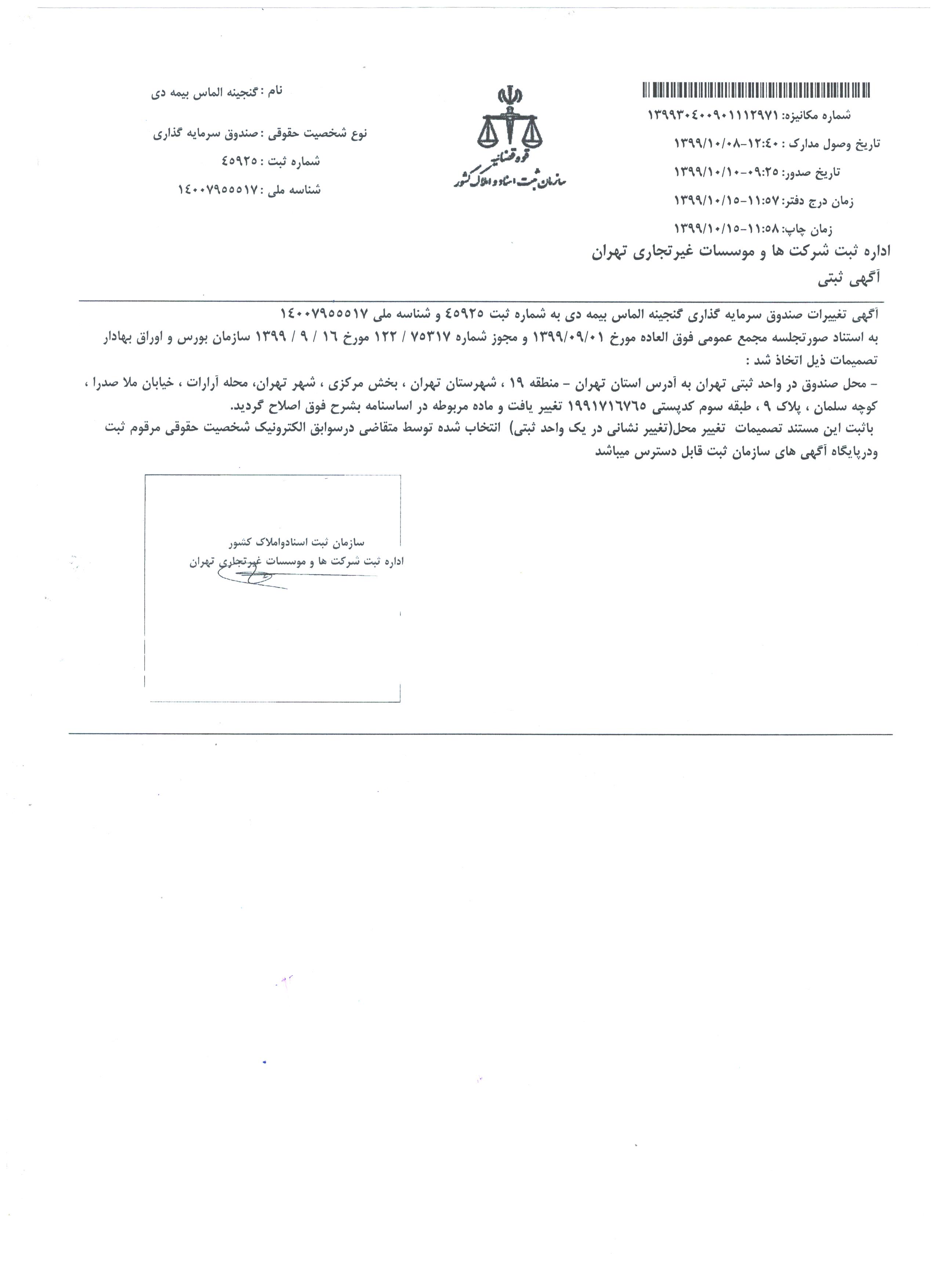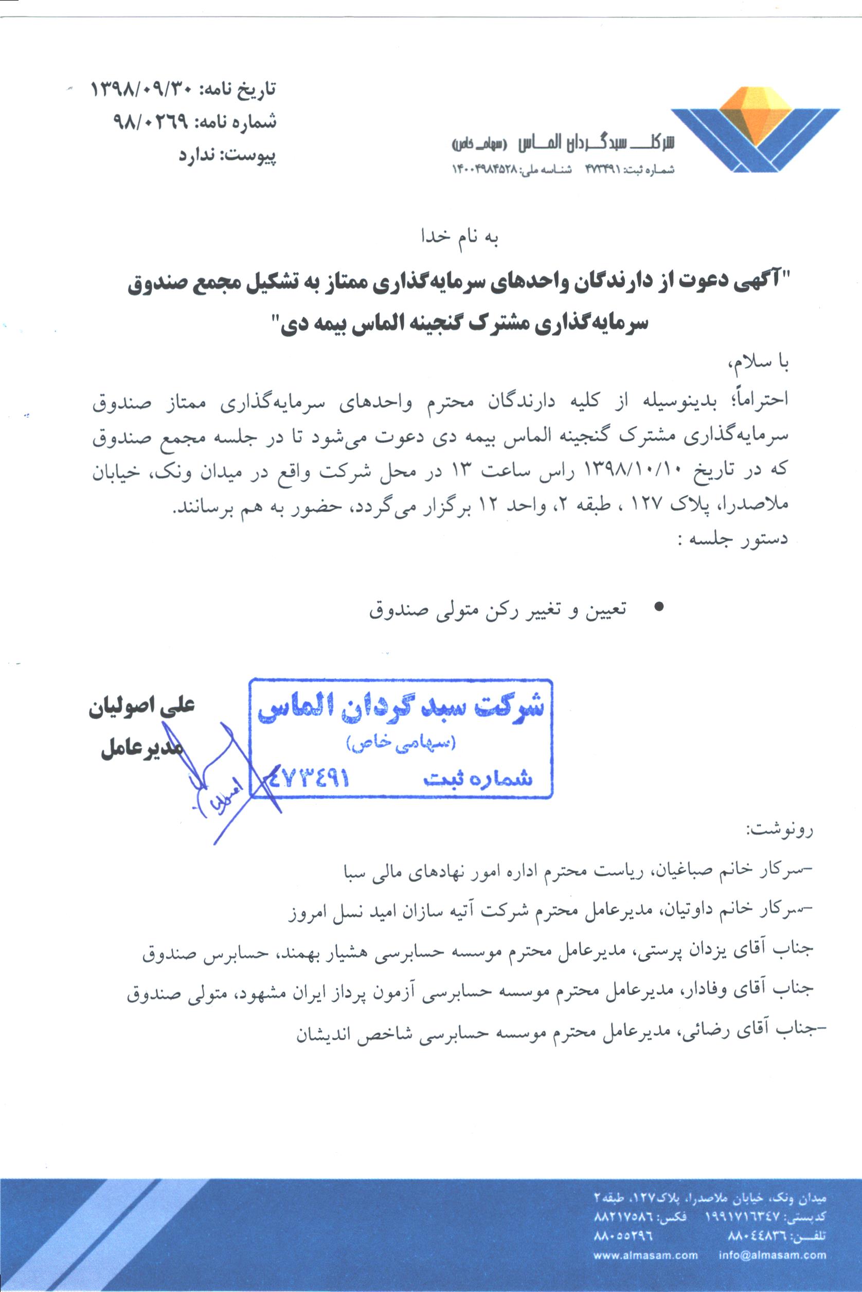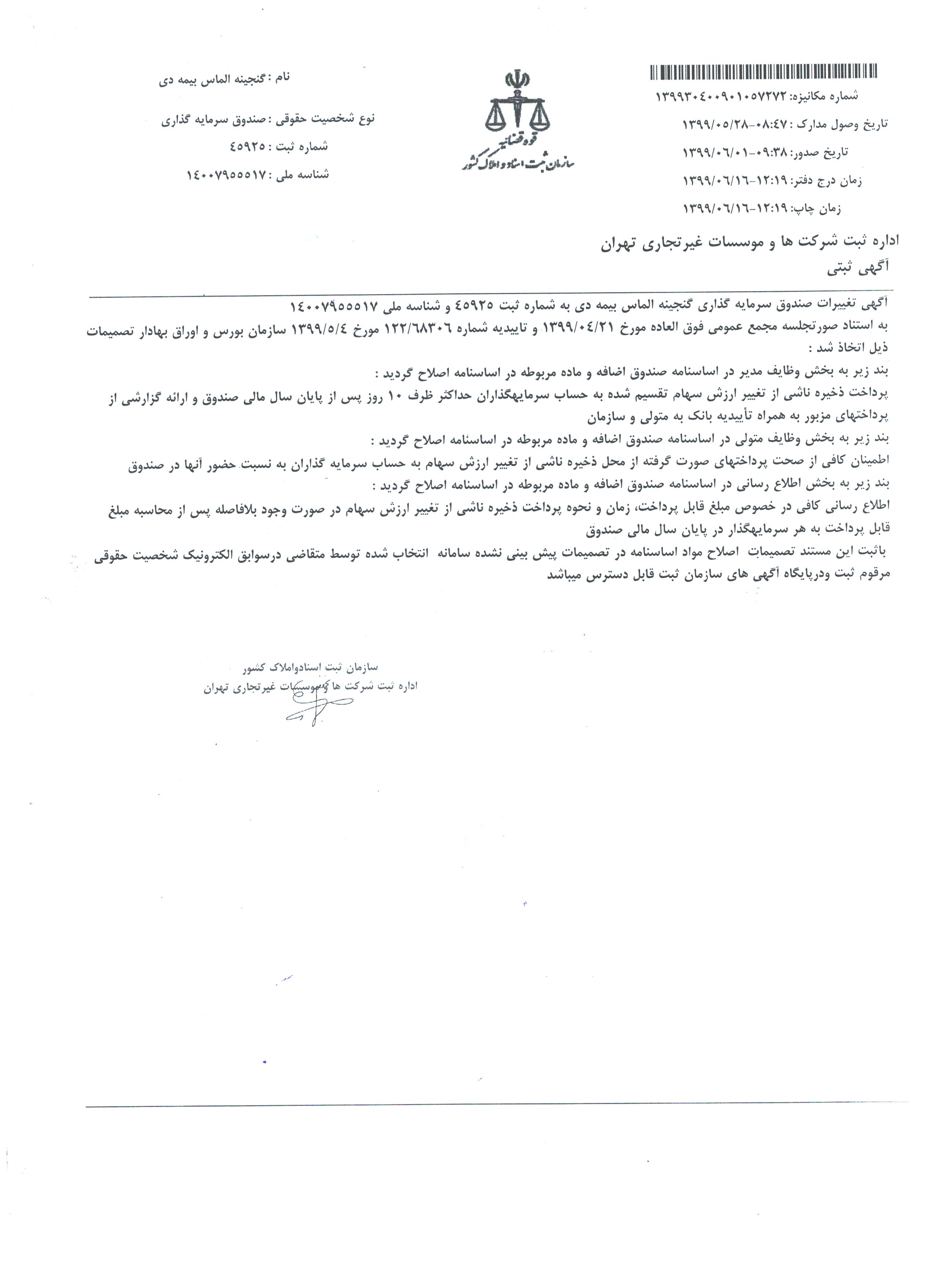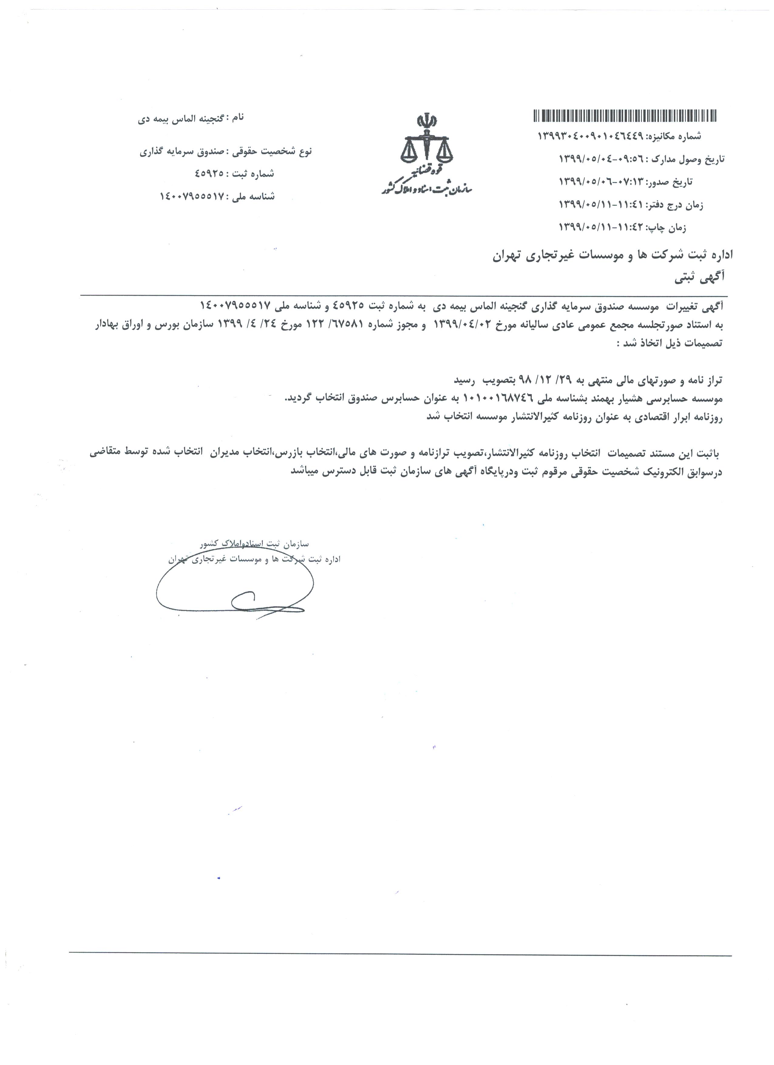 تایید صورت جلسه مجمع ۱۳۹۸/۰۴/۳۱ صندوق گنجینه الماس بیمه دی توسط سازمان