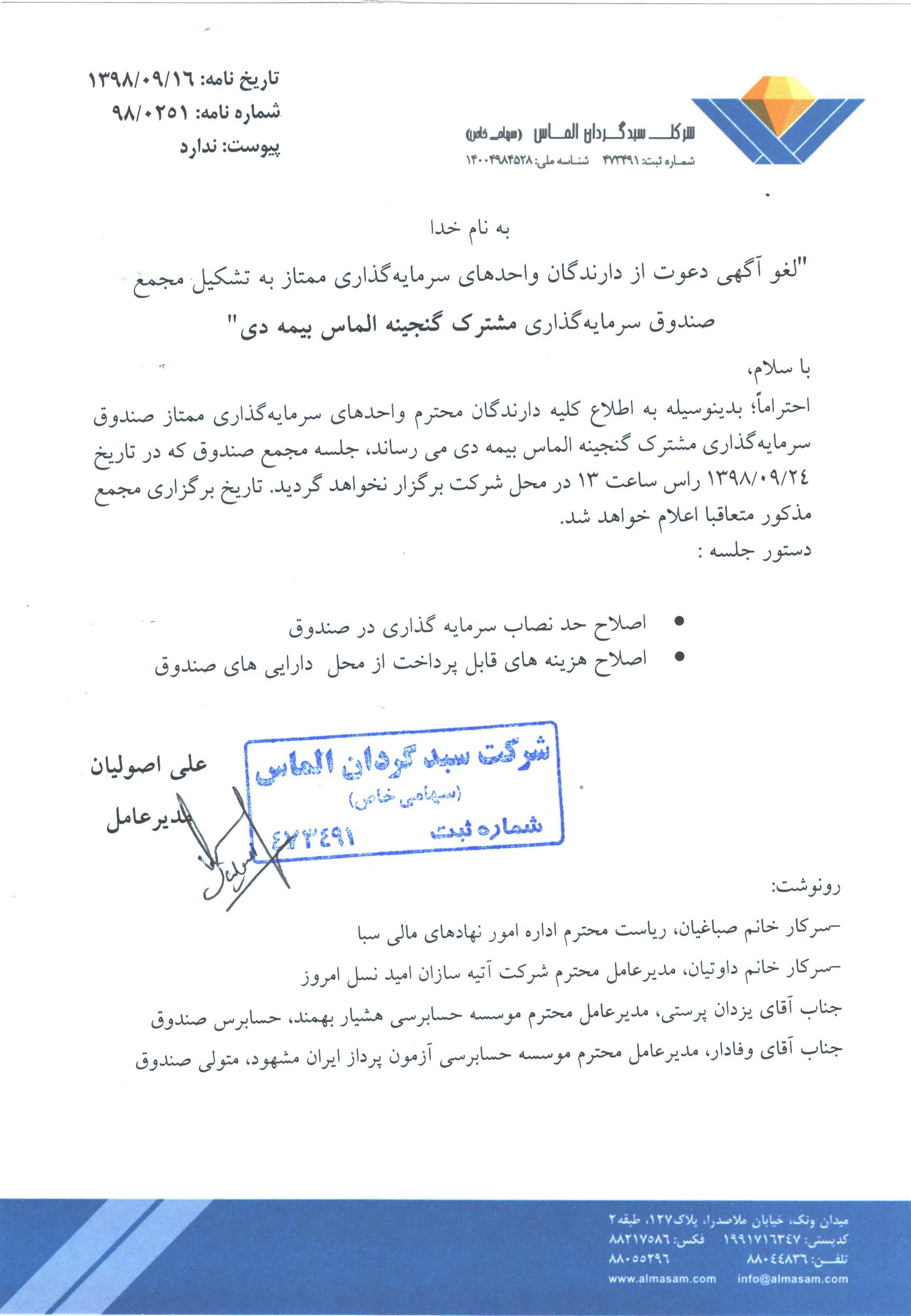 لغو آگهی دعوت به مجمع صندوق مورخ ۱۳۹۸/۰۹/۲۴ساعت ۱۳- اصلاح مفاد امیدنامه