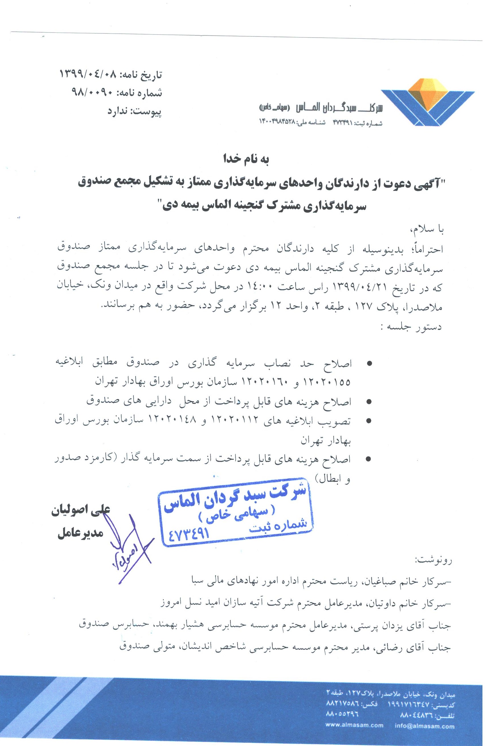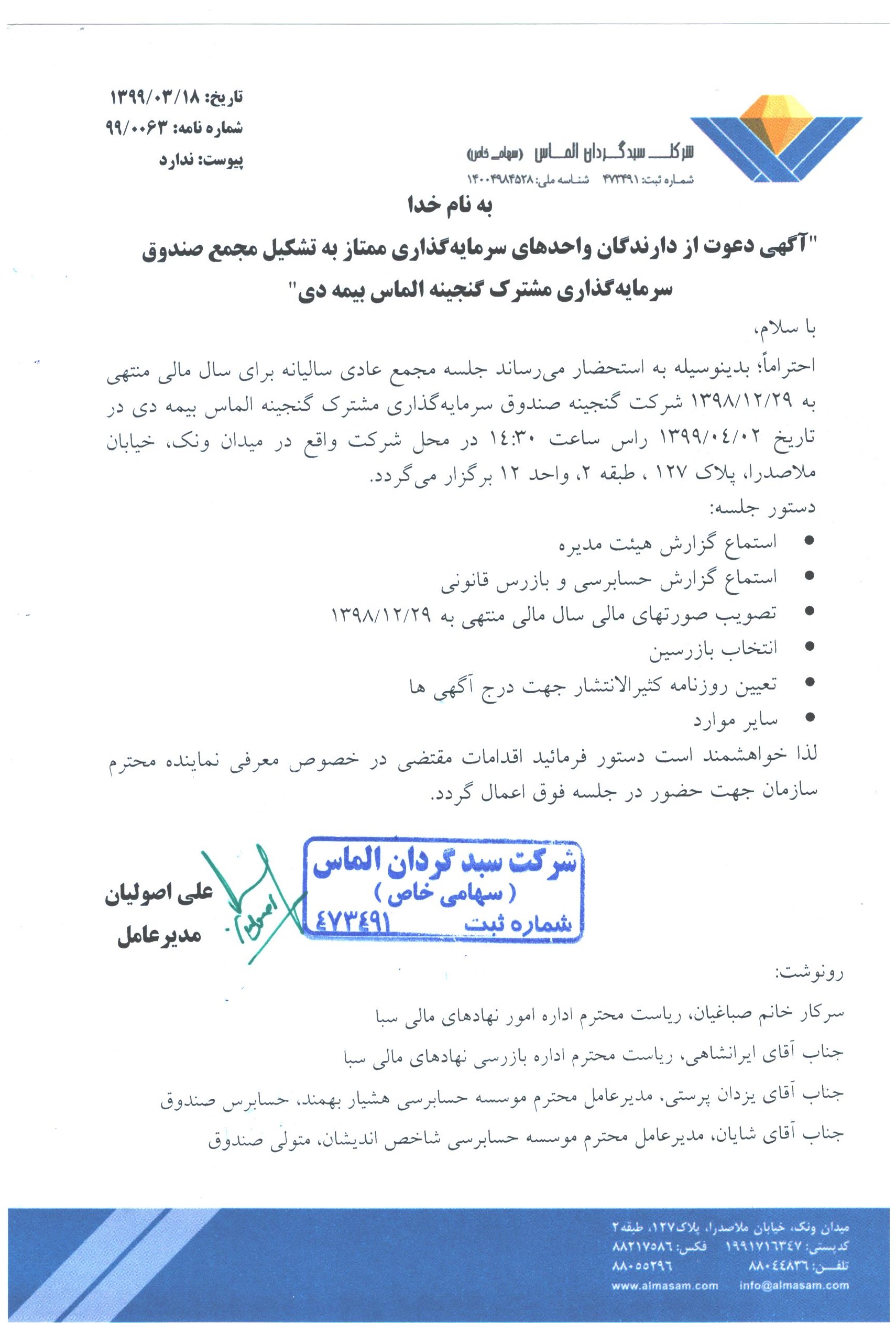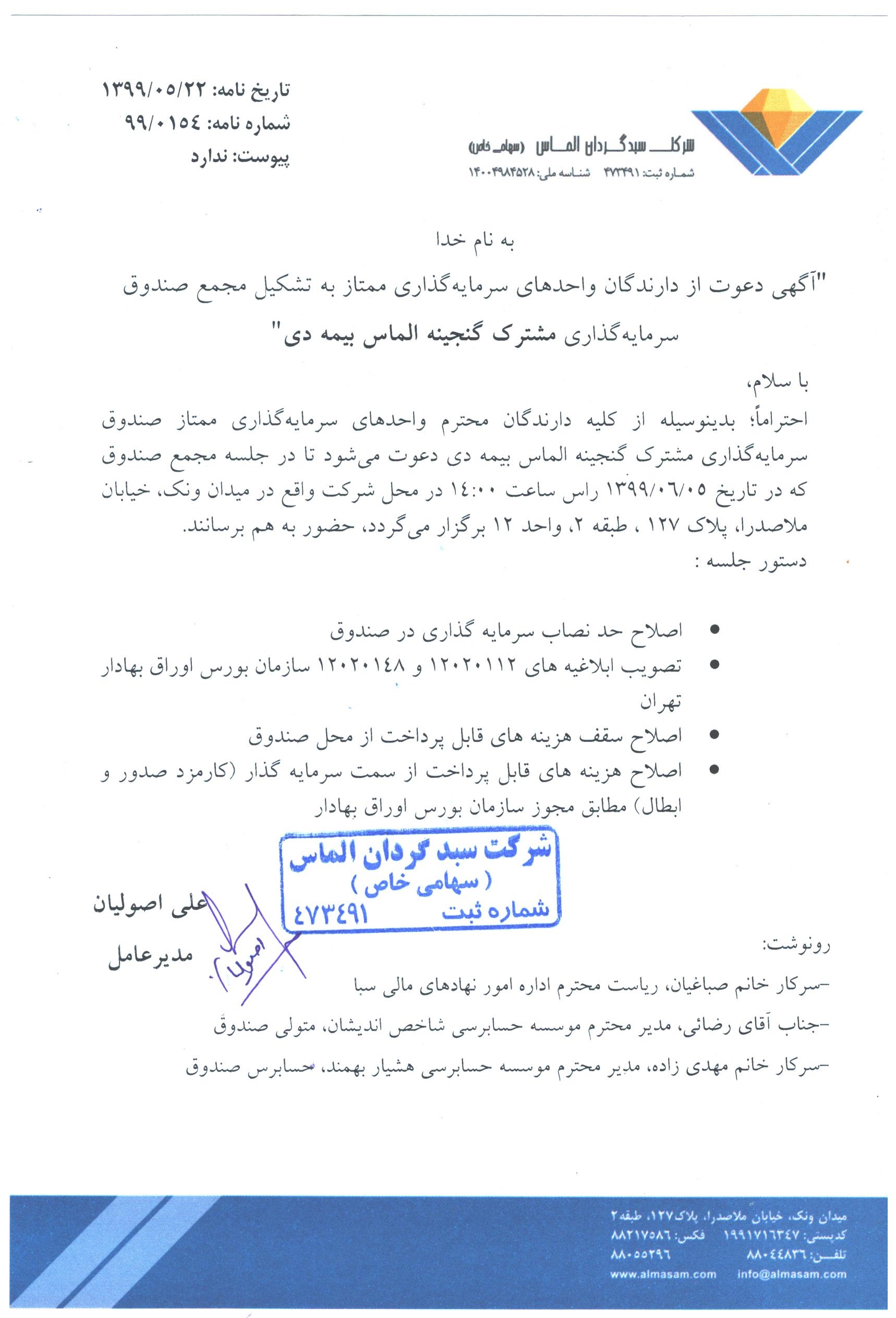 آگهی دعوت به مجمع سالیانه صندوق سرمایه گذاری گنجینه الماس بیمه دی مورخ ۱۳۹۹/۰۴/۰۲