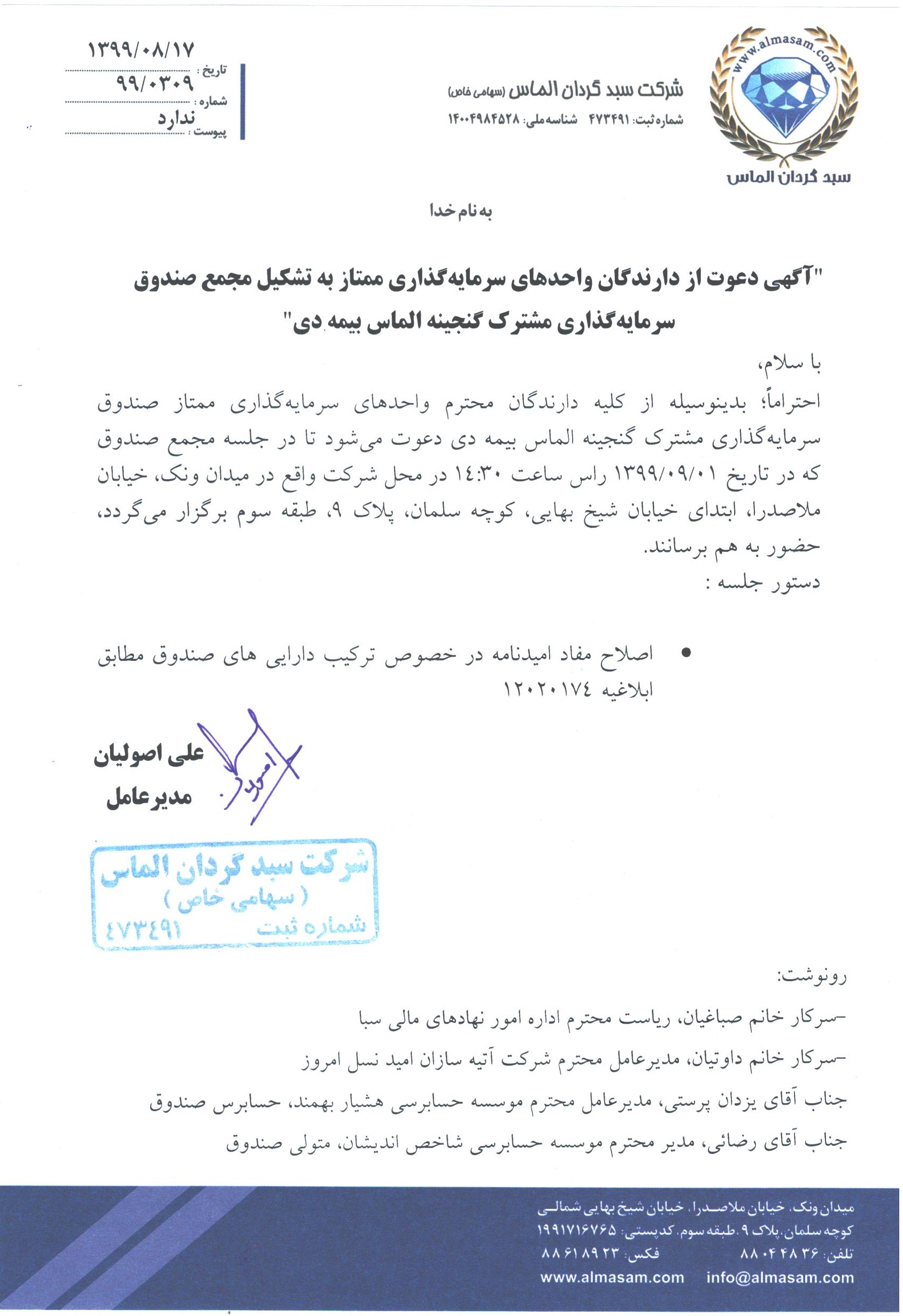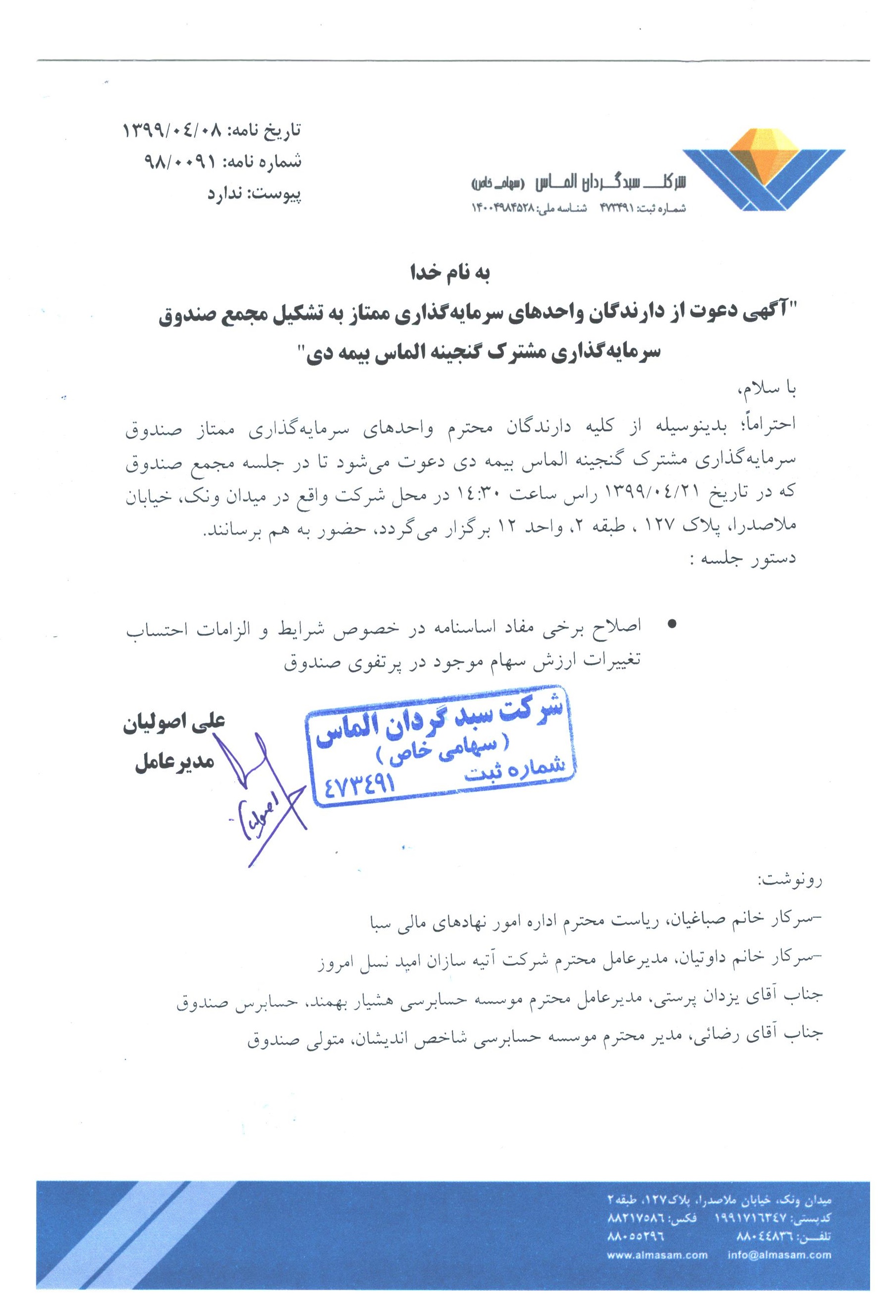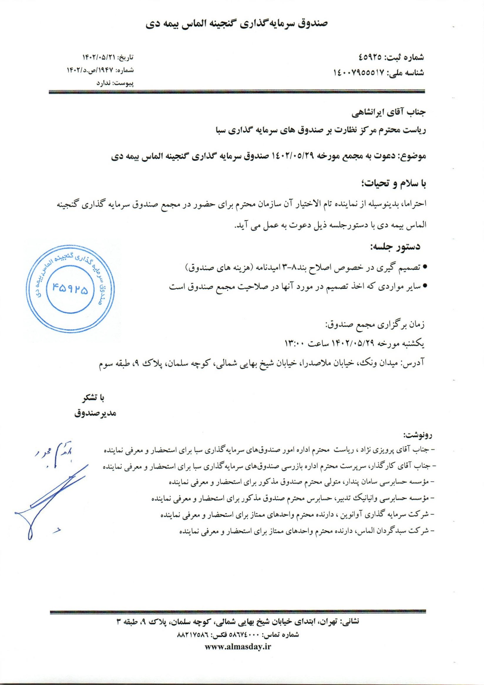 آگهی دعوت به مجمع سالیانه صندوق سرمایه گذاری گنجینه الماس بیمه دی مورخ ۱۳۹۹/۰۴/۰۲