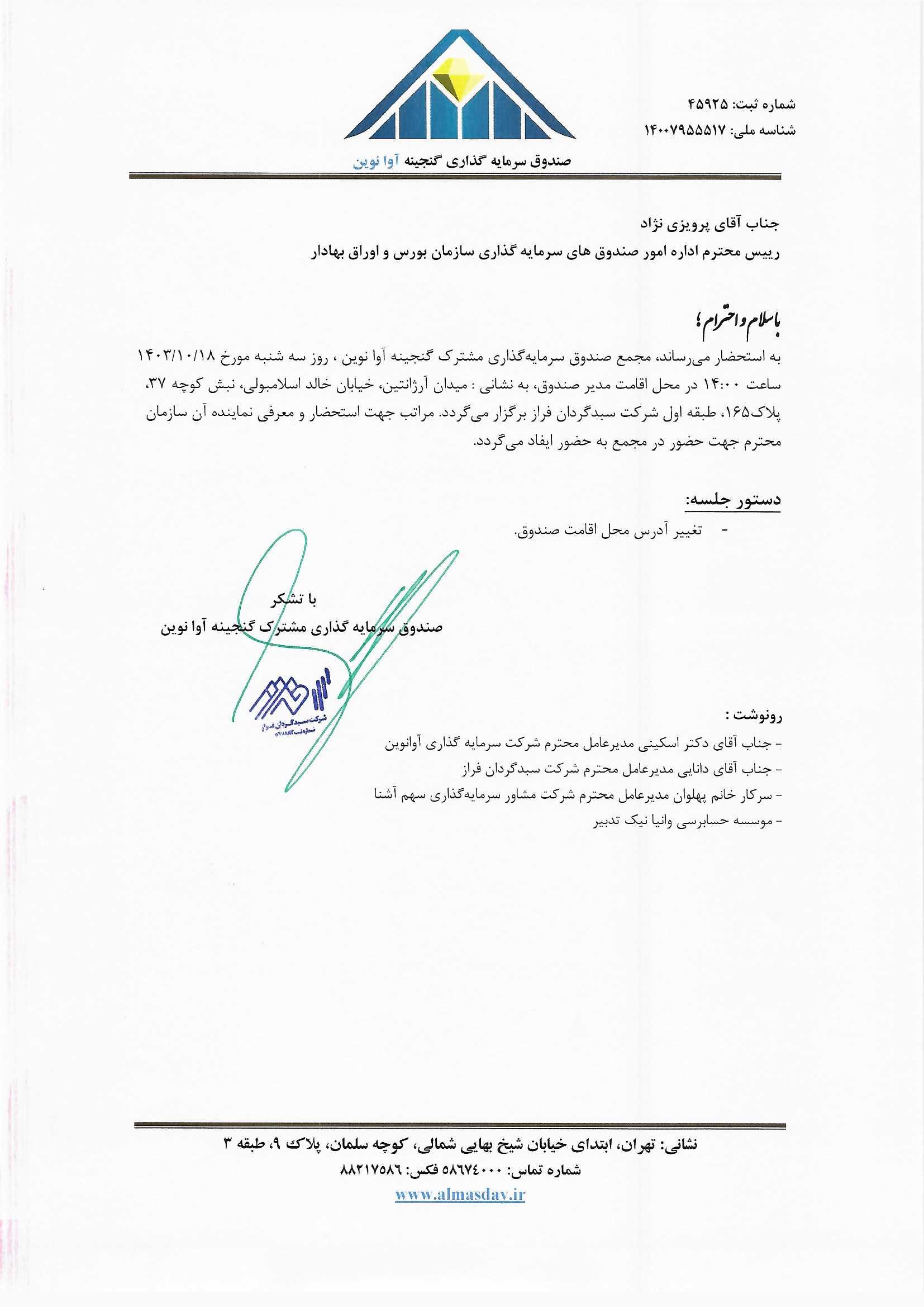 آگهی دعوت به مجمع صندوق مورخ ۱۴۰۳/۱۰/۱۸ ساعت ۱۴:۰۰( تغییر محل اقامت صندوق)