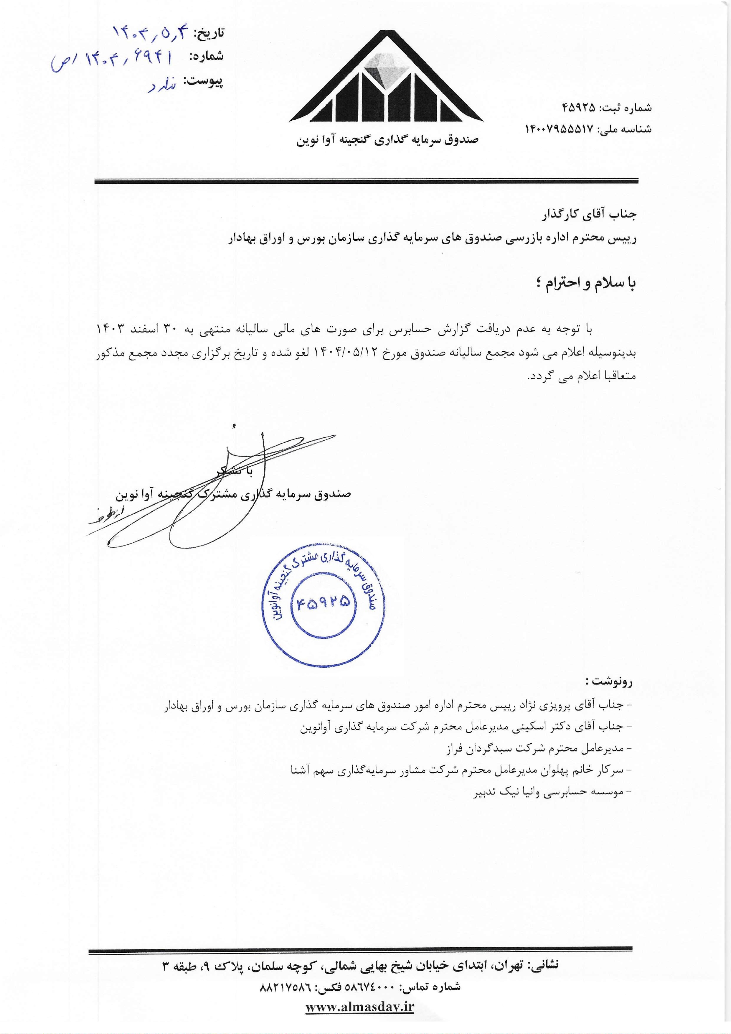 لغو مجمع سالیانه صندوق مورخ ۱۴۰۴/۰۵/۱۲ ساعت ۱۵:۰۰( سال مالی منتهی به ۳۰ اسفند ۱۴۰۳)